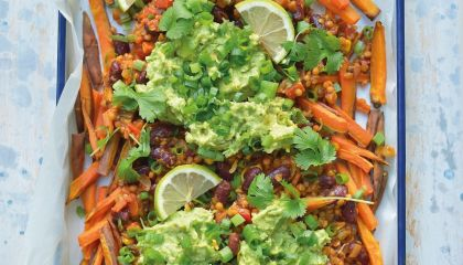 Chili sin carne met zoete aardappelfrietjes en avocadocrème