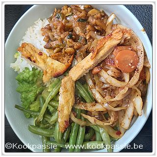 Bowl met jasmijnrijst, gebakken pitta met witte ui, vierkruidenpoeder, koriander en tomato fritto, prinssesenbonen ( 6 min microgolf), romanesco (5 min microgolf), gebakken champignon en courgette