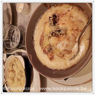 Gebakken prei met champignons, hollandaisesaus, geraspte kaas en varkenshaasje