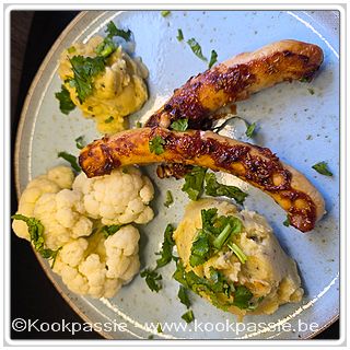 Broccolistoemp (samen gekookt) met worst en uisaus (1710)